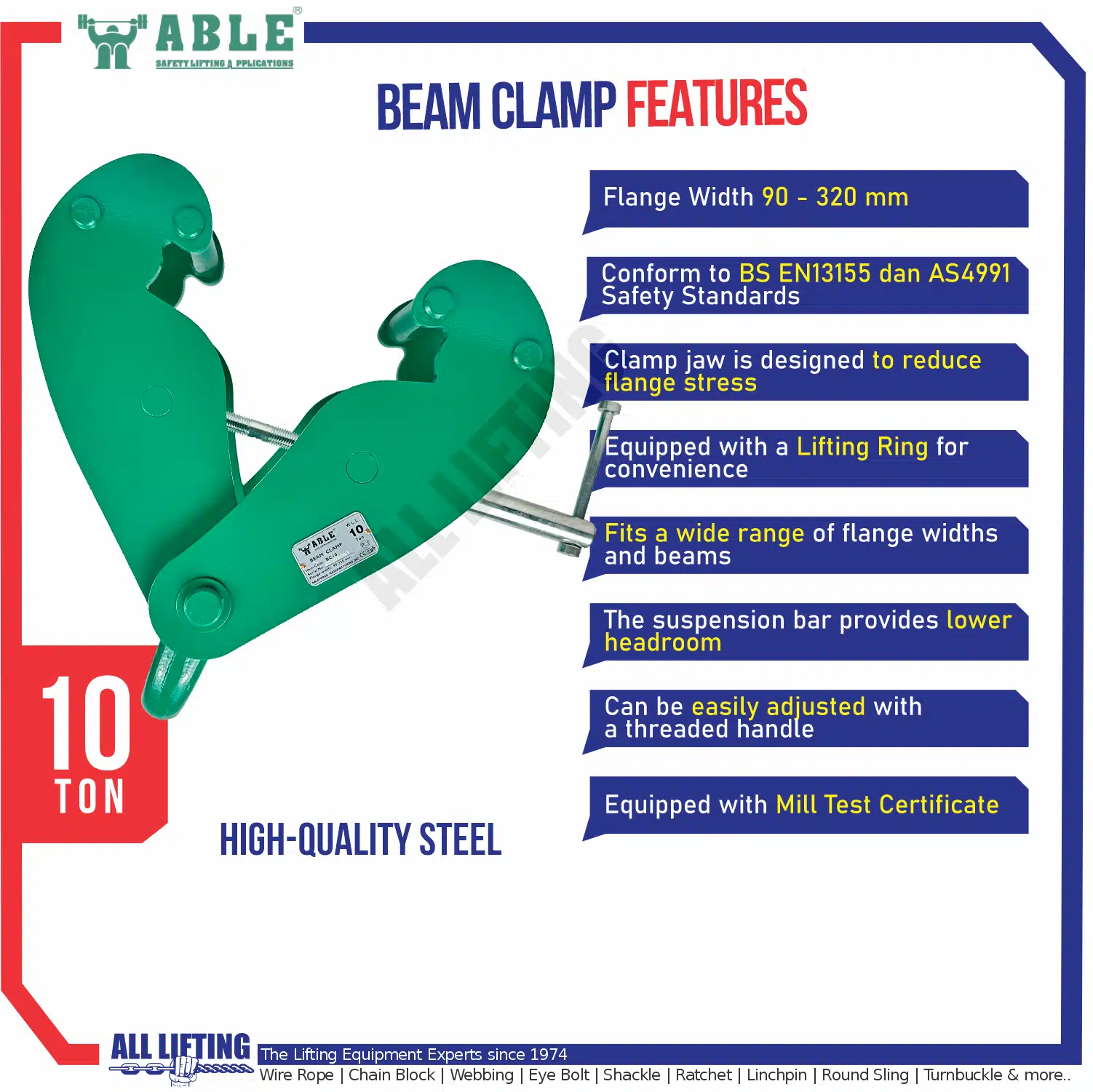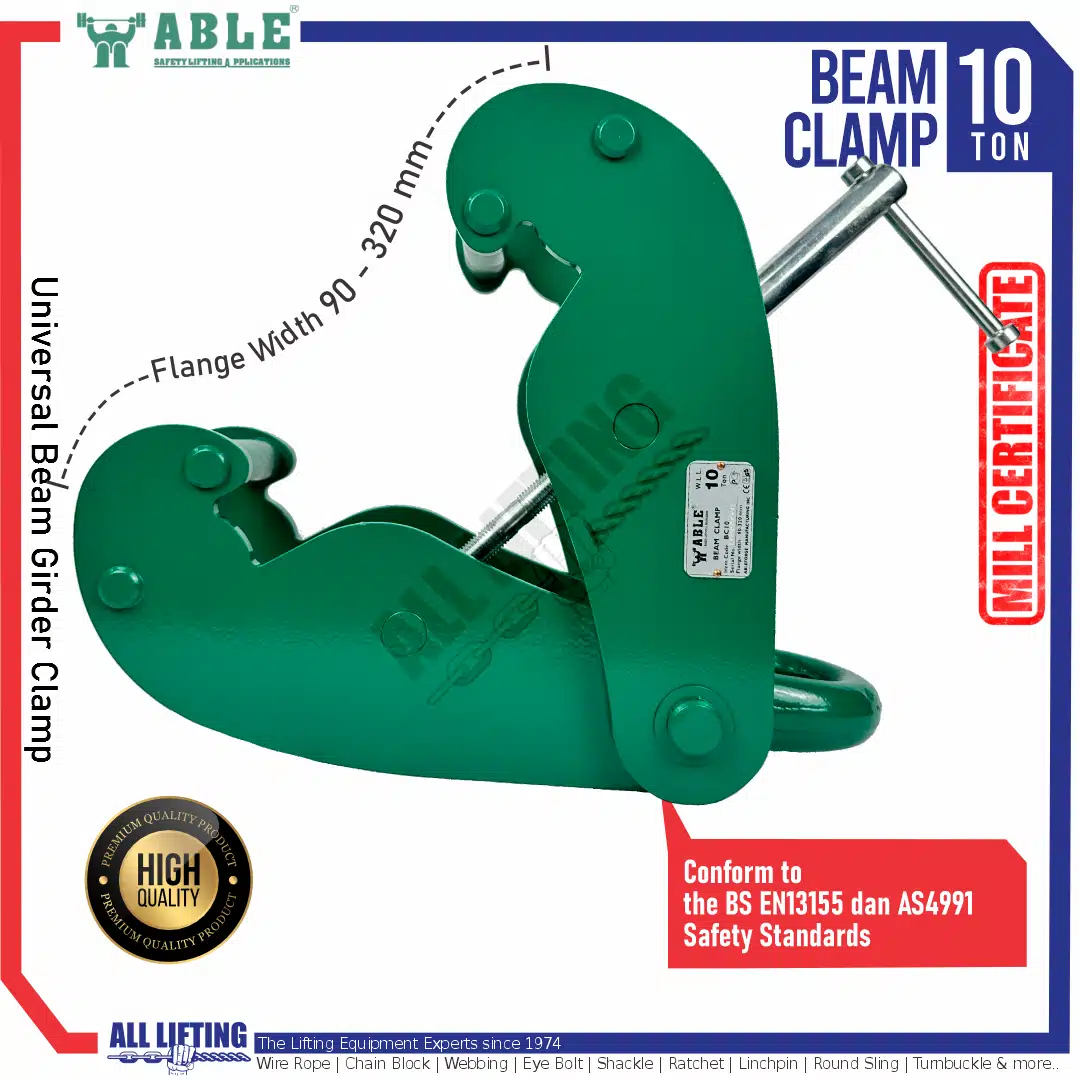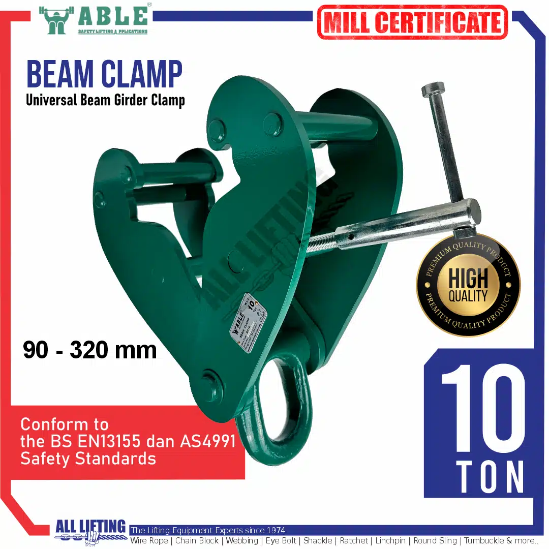 Multipurpose Beam Clamp 10 Ton dapat digunakan untuk menggantung hoist pada girder (I-Beam) juga mengangkat/memindahkan I-Beam dengan mengurangi penggunaan mur, baut atau shackle. Biasa digunakan dalam operasi manufaktur, teknik, dan gudang.