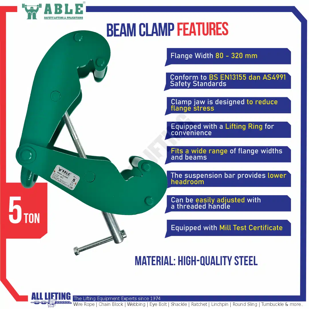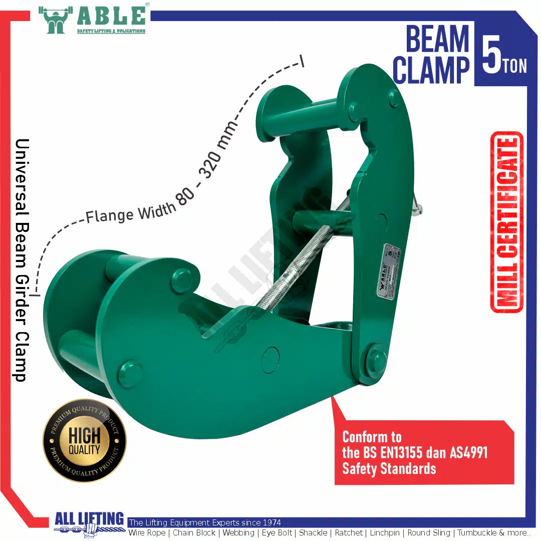 Multipurpose Beam Clamp 5 Ton dapat digunakan untuk menggantung hoist pada girder (I-Beam) juga mengangkat/memindahkan I-Beam dengan mengurangi penggunaan mur, baut atau shackle. Biasa digunakan dalam operasi manufaktur, teknik, dan gudang.