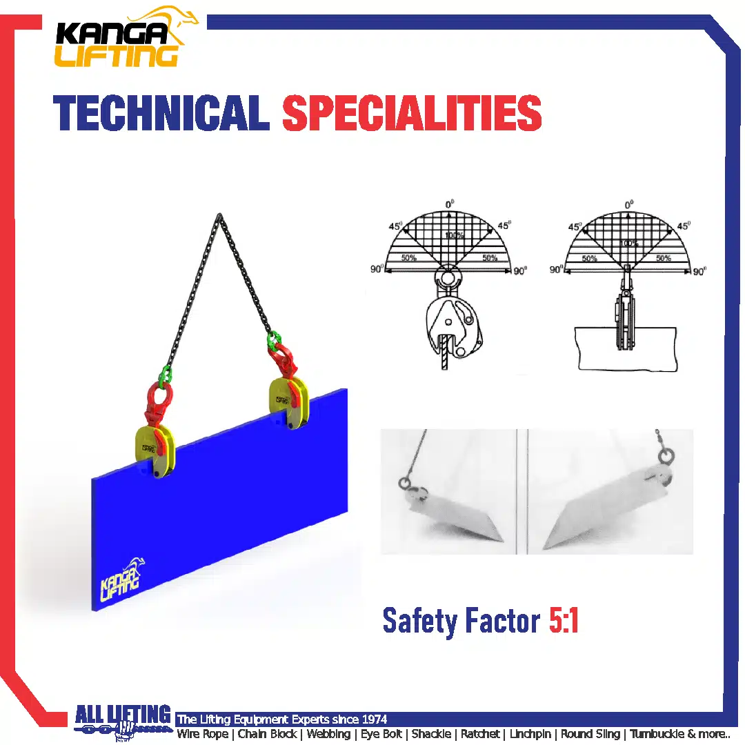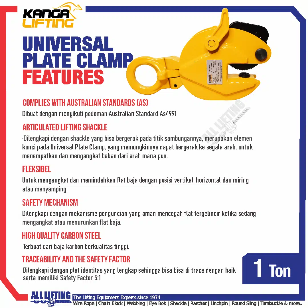 Universal Plate Clamp (Plate Lifting Clamp) 1 Ton dari brand KANGA LIFTING, dirancang untuk memastikan beban dapat diangkat dan diputar (180°) sambil tetap menjaga beban tertahan baik secara vertical, horizontal ataupun miring. Clamp ini memiliki berbagai kegunaan dan sangat cocok untuk mengangkat dan memutar plat baja, bagian kapal, mengekstraksi lembaran tiang pancang dll.